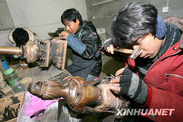 尼泊爾技師巴格達(dá)(前)在鏨刻銅質(zhì)佛像(1月13日攝)。安徽帝雅文化遺產(chǎn)研究保護(hù)中心針對宗教藝術(shù)品的市場需求,從尼泊爾聘請六名富有經(jīng)驗(yàn)的鏨刻技師,開發(fā)宗教銅器藝術(shù)品。