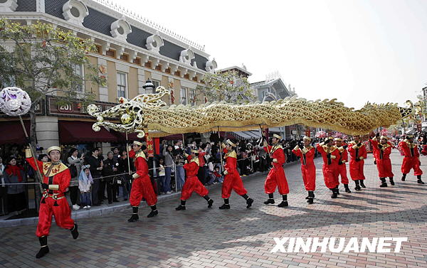 1月15日,演員在預(yù)演“福到滿城賀金!毙麓汗(jié)目——舞龍。為慶祝中國(guó)農(nóng)歷新年,香港迪士尼樂(lè)園裝飾一新,并將于1月16日至2月8日為游客推出以“福到滿城賀金!睘橹黝}的多個(gè)喜慶吉祥的節(jié)目,與游客共慶傳統(tǒng)佳節(jié)。