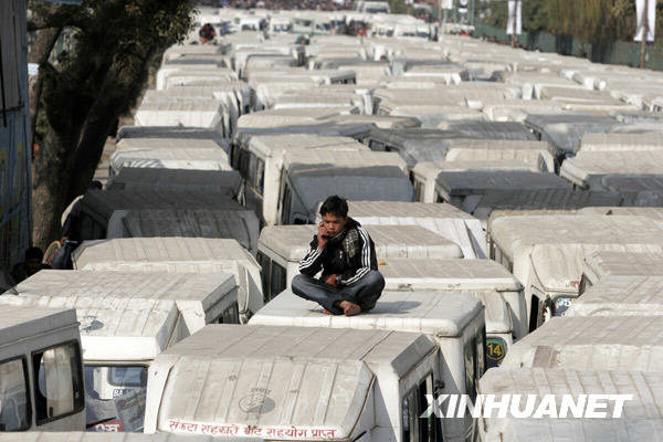 1月15日,在尼泊爾首都加德滿都,一名電動(dòng)車司機(jī)坐在車頂上。