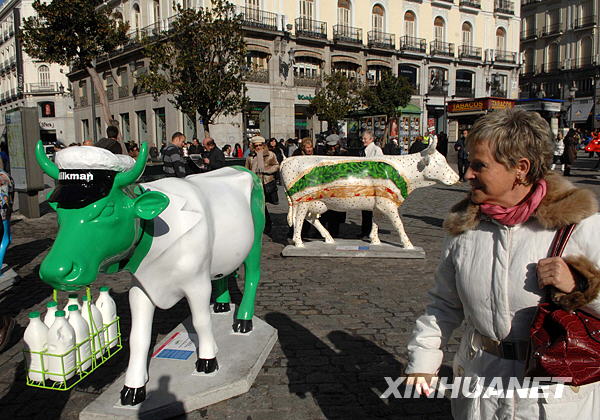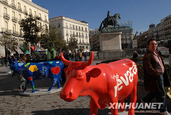 1月16日,在西班牙首都馬德里太陽門廣場,“藝術!背蔀橐坏廓毺氐木坝^。 當日,100多座造型生動、構思精巧的“藝術牛”雕塑作品在馬德里街頭現身!八囆g!被顒佑1998年起源于瑞士,是世界上著名的公共藝術活動,已在全球多個城市舉辦。