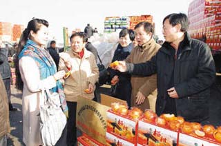 | 衢州市柯城區(qū)委副書記胡松(右二)、柯城區(qū)人大副主任鄭曉霞(右三)、衢州市柯城區(qū)副區(qū)長王國強(qiáng)(右一)等衢州柯城區(qū)領(lǐng)導(dǎo)走到北京新發(fā)地農(nóng)產(chǎn)品批發(fā)市場銷售現(xiàn)場向顧客介紹衢州椪柑。 | 由國際柑橘學(xué)會主辦、中國柑橘學(xué)會和華中農(nóng)業(yè)大學(xué)承辦的第11屆國際柑橘大會2008年10月間在武漢召開,會上發(fā)布,中國柑橘種植面積和產(chǎn)量目前均躍居世界第一。2008年全國柑桔普遍豐產(chǎn),預(yù)計(jì)總產(chǎn)量達(dá)2200萬噸左右,這年,浙江衢州柯城椪柑種植再獲豐收,產(chǎn)量近40萬噸,柑橘是柯城區(qū)農(nóng)民經(jīng)濟(jì)收入的主要來源,全區(qū)80%的鄉(xiāng)(鎮(zhèn))村主要收入來源于柑橘,2008年柑桔產(chǎn)業(yè)收入達(dá)4.8億,占全區(qū)農(nóng)業(yè)總產(chǎn)值的54.58%,在農(nóng)民收入中的占比達(dá)到70%。但由于國際金融危機(jī)的影響,水果消費(fèi)需求下降,柑橘銷售直接關(guān)系到當(dāng)?shù)貜V大桔農(nóng)的切身利益,為此,衢州市柯城區(qū)委、區(qū)政府急桔農(nóng)所急、想桔農(nóng)所想,重拳出擊,區(qū)里領(lǐng)導(dǎo)分別帶隊(duì)于今年春節(jié)前赴北京、哈爾濱、杭州等城市開展“衢州椪柑推介會”等促銷活動,促進(jìn)椪柑的銷售。