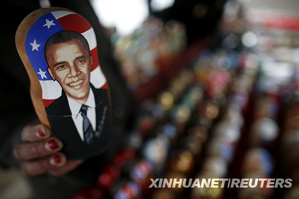 1月19日,在保加利亞首都索非亞的一家商店里,營(yíng)業(yè)員拿著繪有美國(guó)當(dāng)選總統(tǒng)奧巴馬頭像的俄羅斯套娃。來自民主黨的當(dāng)選總統(tǒng)貝拉克·奧巴馬的就職儀式即將于1月20日舉行。新華社/路透