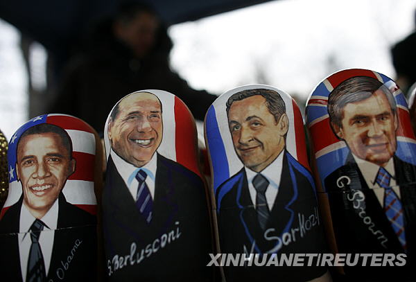 1月19日,在保加利亞首都索非亞的一家商店里,繪有美國(guó)當(dāng)選總統(tǒng)奧巴馬頭像的俄羅斯套娃(左一)與國(guó)際政壇人物套娃擺放在一起。新華社/路透