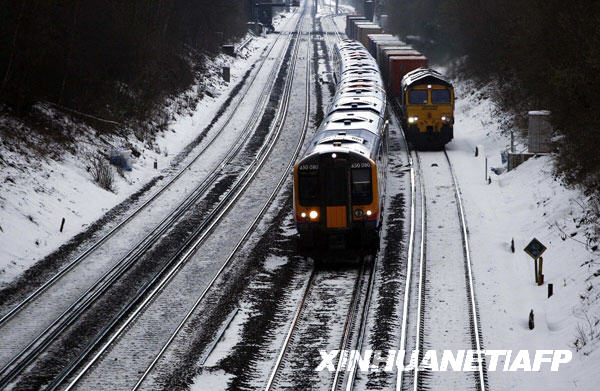 2月3日,在英國(guó)漢普郡,一列客車在布滿積雪的鐵道上行駛。英國(guó)行業(yè)協(xié)會(huì)當(dāng)日公布的一份調(diào)查數(shù)據(jù)顯示,大雪給英國(guó)造成的經(jīng)濟(jì)損失可能超過10億美元。如果降雪持續(xù),這一數(shù)字可能繼續(xù)上升,使本已陷入衰退的英國(guó)經(jīng)濟(jì)雪上加霜。新華社/法新