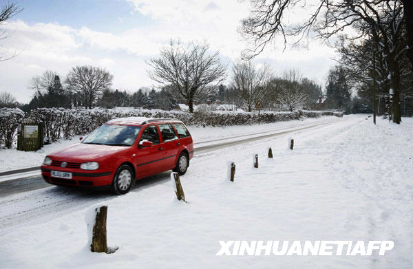 2月3日,在英國(guó)漢普郡,一輛轎車在布滿積雪的道路上行駛。新華社/法新