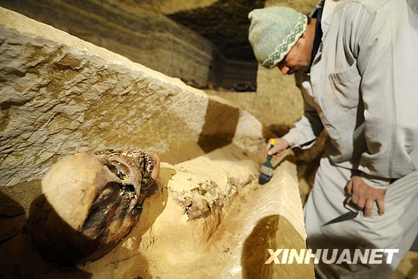 2月11日,在埃及開羅以南的塞加拉地區(qū)的墓地中,工作人員清理一具木乃伊身上的塵土。當日,埃及最高文物委員會主席扎!す咚乖谶@個墓地中打開了一具新發(fā)現(xiàn)的古埃及石棺,并從中找到一具保存完好的木乃伊。埃及考古學家此前在這個位于塞加拉地區(qū)著名的階梯金字塔西南的墓地中發(fā)現(xiàn)了木乃伊、木棺和石棺等文物共30件,這些文物的歷史可追溯到2600年前。