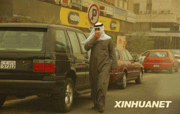2月11日,在科威特街頭,一男子用頭巾捂住口鼻遮擋風(fēng)沙。2月11日,科威特遭遇今年以來(lái)的最強(qiáng)沙塵天氣,天空變成灰蒙蒙的一片,沙漠地區(qū)能見度降低到幾十米。