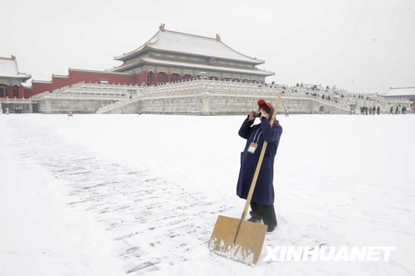 2月19日,北京故宮博物院的一位清潔工在工作間隙拍攝雪景。經(jīng)過(guò)連續(xù)3日的降雪,北京故宮銀裝素裹,別有一番韻味。