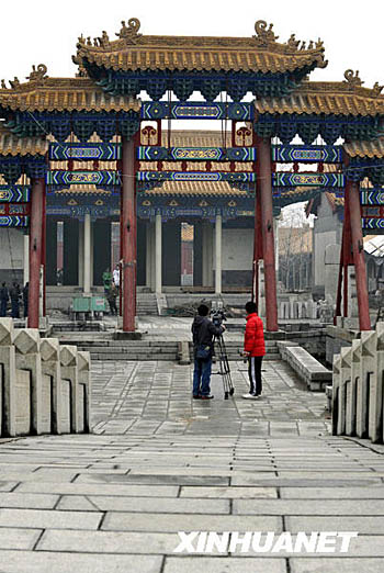 2月19日,兩位記者在濟(jì)南府學(xué)文廟屏樓前拍攝。