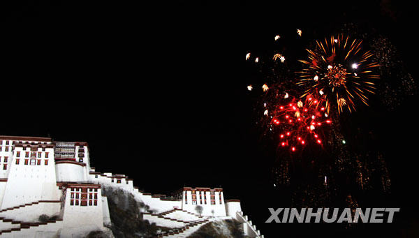 2月23日晚,禮花在布達(dá)拉宮上空綻放。