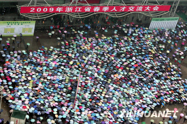 28日,求職者冒雨在杭州和平國際會展中心廣場排隊(duì),等候入場。當(dāng)日,2009年浙江省春季人才交流大會在杭州和平國際會展中心舉行,約1300家企事業(yè)單位提供了2.6萬個崗位,其中針對應(yīng)屆畢業(yè)生的崗位超過1萬個,吸引了數(shù)萬名來自省內(nèi)外的求職者。新華社發(fā)
