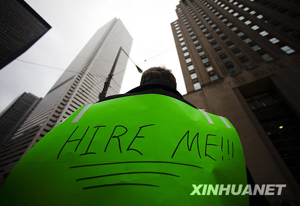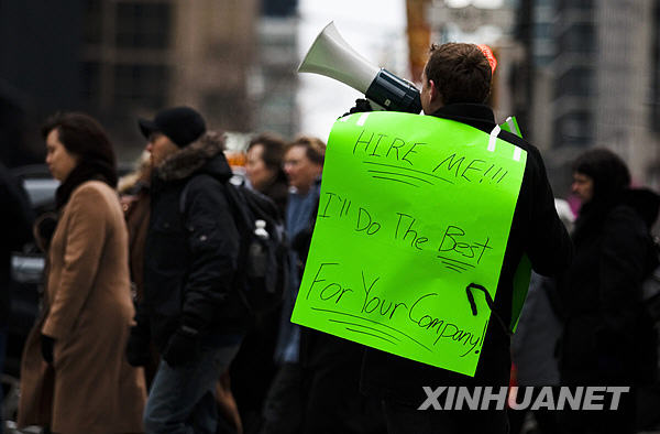 3月5日,在加拿大多倫多街頭,一名男子身披寫有“雇用我吧!”字樣和個(gè)人簡(jiǎn)歷的紙衣,在街頭使用擴(kuò)音器找工作。據(jù)加拿大統(tǒng)計(jì)局公布的數(shù)據(jù),今年1月,加拿大新增失業(yè)人數(shù)達(dá)到12.9萬人,創(chuàng)30年來月最高紀(jì)錄,失業(yè)率由2008年12月的6.6%升至7.2%。新華社/路透 |