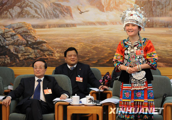 3月6日,出席十一屆全國人大二次會議的重慶代表團(tuán)審議政府工作報(bào)告。全國人大代表、苗族姑娘李小燕在席間唱起山歌,表達(dá)喜悅心情。