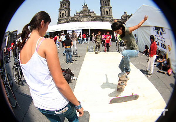 3月7日,在墨西哥首都墨西哥城的憲法廣場,女孩們進(jìn)行滑板表演。當(dāng)天,世界各地的人們用不同的方式慶祝國際勞動婦女節(jié)。新華社發(fā)