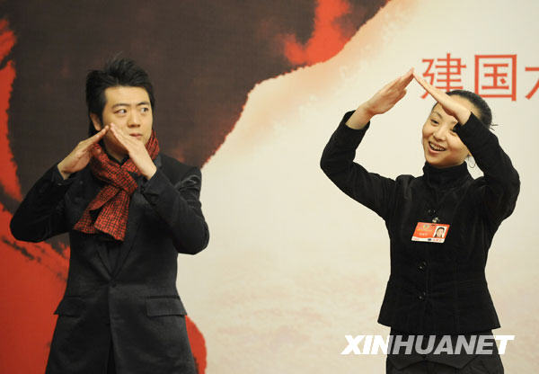 3月8日,郎朗(左)在開機儀式上向邰麗華學習如何用手語表達《國家》中的一句歌詞“我愛我國家”。當日,新中國成立60周年獻禮歌曲《國家》在北京舉行MV拍攝開機儀式,鋼琴演奏家郎朗參加拍攝,在MV中為歌曲進行鋼琴演奏。