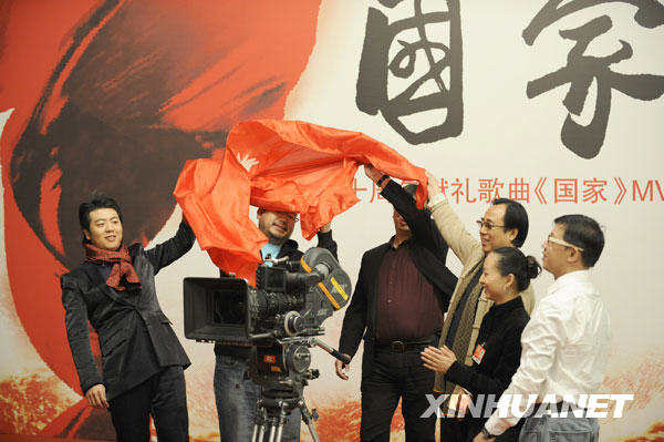 3月8日,郎朗(左一)、導演張一白(左二)等《國家》創(chuàng)作團隊成員及嘉賓為《國家》MV“開機”。