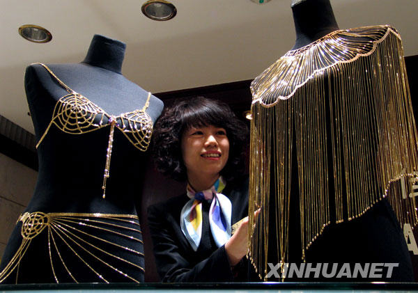 3月10日,濟南一家金店展出用18K黃金打造的披肩和內衣。