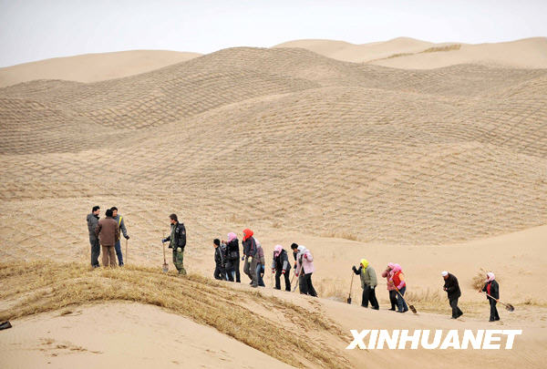 3月12日,寧夏靈武市白芨灘林場(chǎng)職工在毛烏素沙漠邊緣扎草方格。被騰格里、毛烏素、烏蘭布和三大沙漠包圍的寧夏回族自治區(qū)長(zhǎng)年干旱少雨,是我國(guó)土地沙漠化最嚴(yán)重的地區(qū)之一。近年來,自治區(qū)不斷加大治沙力度,在沙漠邊緣大面積扎草方格固沙植樹,在沙塵源頭筑成一道“草長(zhǎng)城”。目前全區(qū)已累計(jì)治理沙化土地47萬公頃,沙化土地面積由建國(guó)初的165萬公頃減少到目前的118.3萬公頃,在全國(guó)率先實(shí)現(xiàn)荒漠化逆轉(zhuǎn)。 | |