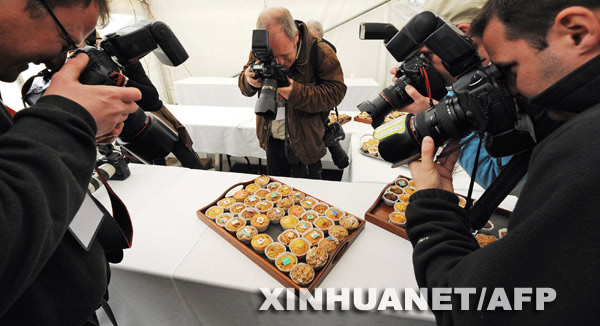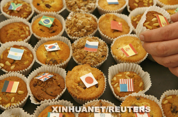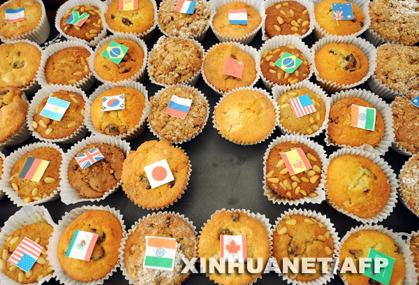 3月14日,在英國首都倫敦以南約50公里的霍舍姆的新聞中心,各國攝影記者的鏡頭聚焦在貼有二十國集團成員旗幟的小點心上。新華社/法新