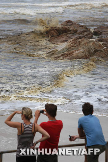 3月13日,在澳大利亞昆士蘭州庫魯姆,游客觀望被污染的海水。一艘貨輪11日在昆士蘭州附近海域遭遇風暴,導致約大量燃油泄漏,船上搭載的一些裝有化學品的集裝箱也落入海中。澳大利亞有關方面稱澳東北部數(shù)十個觀光海灘已被泄漏的燃油和化學品污染。新華社/法新