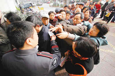 圖為3月16日,南京某銀行網(wǎng)點工作人員給排隊購買國債的市民發(fā)號。