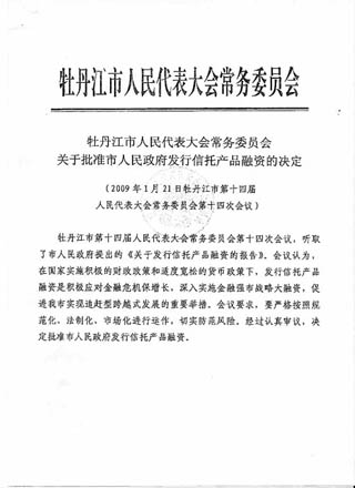 2009年1月21日,牡丹江市人大常委會全票通過,批準(zhǔn)政府發(fā)行信托產(chǎn)品融資。