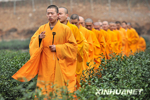 3月19日,杭州法凈寺的僧人在“灑凈儀式”上。當日,杭州古剎法凈寺的僧人開始在寺院的龍井茶地里采摘“法凈禪茶”。“法凈禪茶”出于“西湖龍井茶”一系,是杭州法凈寺的僧人自種、自采、自炒和自用的有機綠茶。禪茶是佛家“以茶悟道”的一種特有茶文化,來源于“茶禪一味、茶僧一緣、茶寺一體”之說。