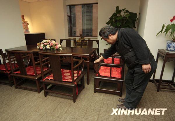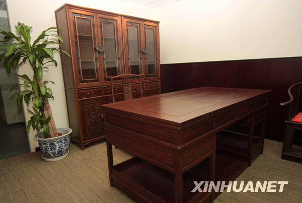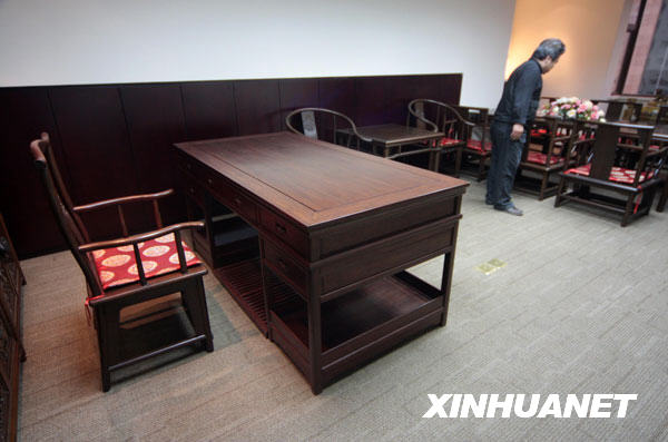 3月23日拍攝的展出的“羅格奧運(yùn)辦公家具”。據(jù)悉,國(guó)際奧委會(huì)主席羅格在北京奧運(yùn)會(huì)期間使用過(guò)的20件仿古風(fēng)格辦公家具將于3月底在北京拍賣(mài)。這套辦公家具以竹子為主料,包括書(shū)桌、官帽椅、書(shū)柜、會(huì)議桌椅、花幾、電視柜、圈椅等。