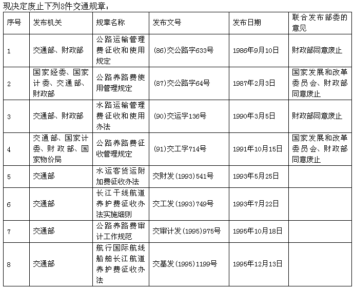《關(guān)于廢止8件交通規(guī)章的決定》已于2009年2月17日經(jīng)第2次部務(wù)會議通過,現(xiàn)予公布,自公布之日起施行。