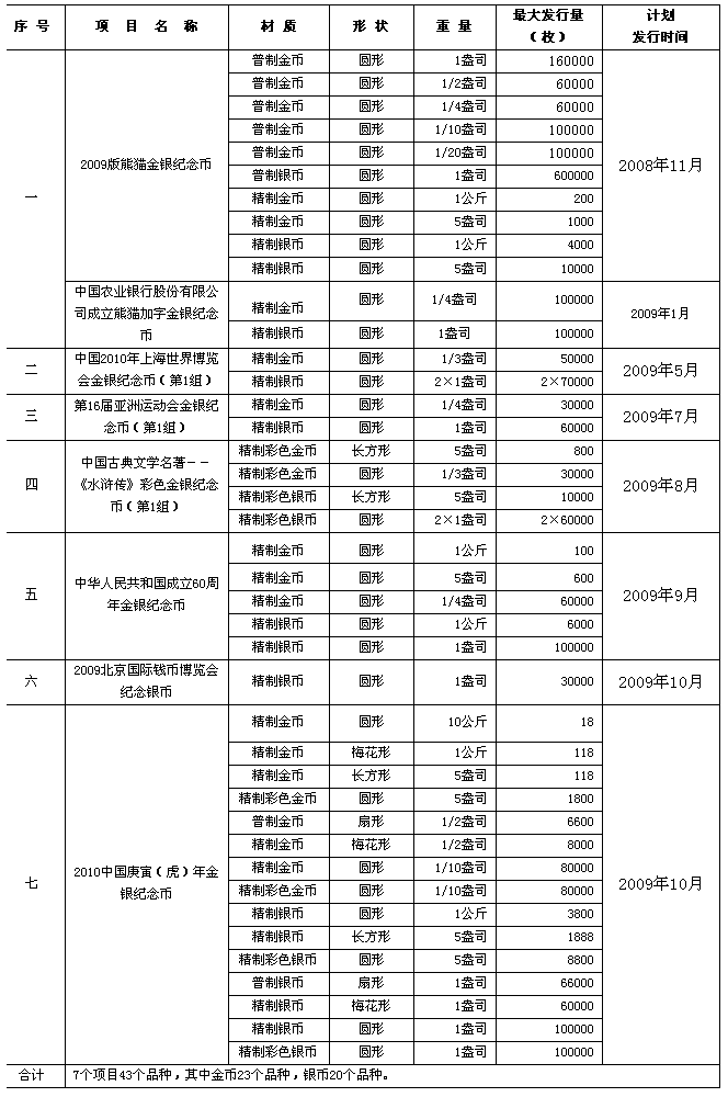 這7個項目分別為:2009版熊貓金銀紀念幣(其中包含中國農(nóng)業(yè)銀行股份有限公司成立熊貓加字金銀紀念幣)、中國2010年上海世界博覽會金銀紀念幣(第1組)、第16屆亞洲運動會金銀紀念幣(第1組)、中國古典文學(xué)名著——《水滸傳》彩色金銀紀念幣(第1組)、中華人民共和國成立60周年金銀紀念幣、2009北京國際錢幣博覽會紀念銀幣、2010中國庚寅(虎)年金銀紀念幣。上述項目中,2009版熊貓金銀紀念幣已于2008年11月發(fā)行。