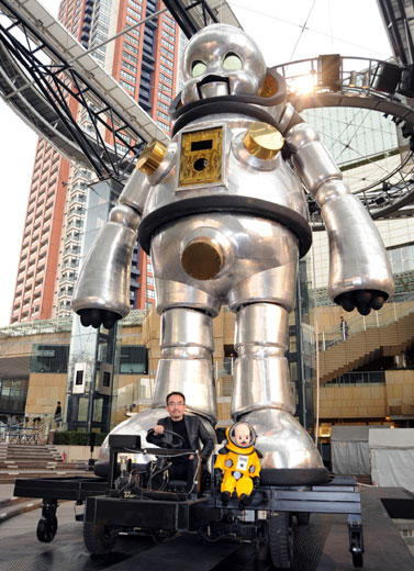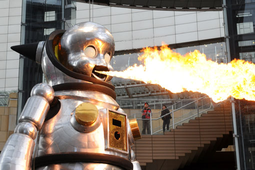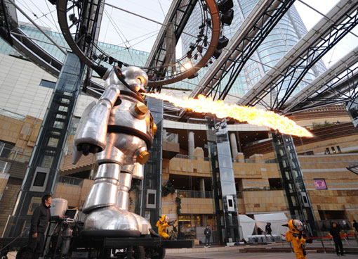 3月27日,日本著名美術(shù)家矢延憲司制作的高7.2米的巨型機器人“巨人Torayan”出現(xiàn)在東京街頭,他不僅能載歌載舞,還能從嘴部噴射出巨大的火焰,令人們大為吃驚。
