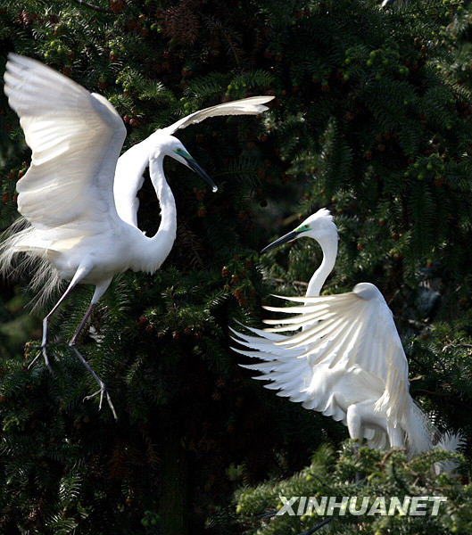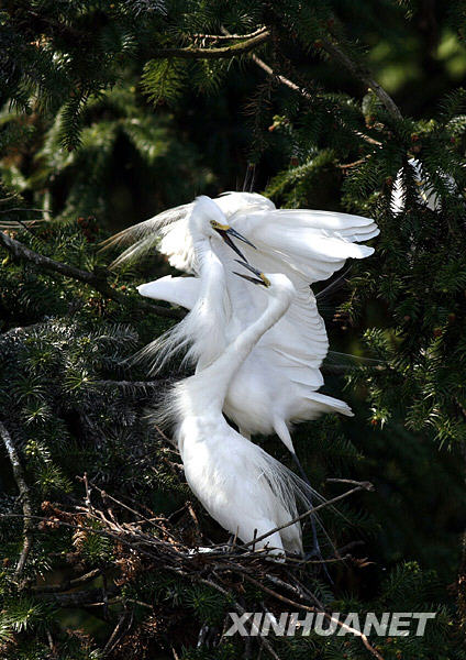 4月6日,一對白鷺在林中嬉戲。新華社發(fā)(沈俊峰 攝)