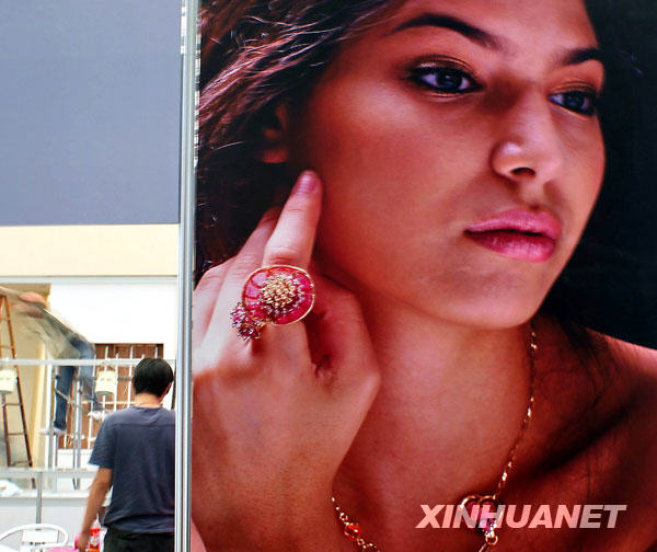 5月12日,工作人員在國(guó)際珠寶展現(xiàn)場(chǎng)安裝鉆石飾品廣告。新華社發(fā)