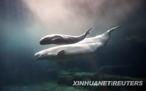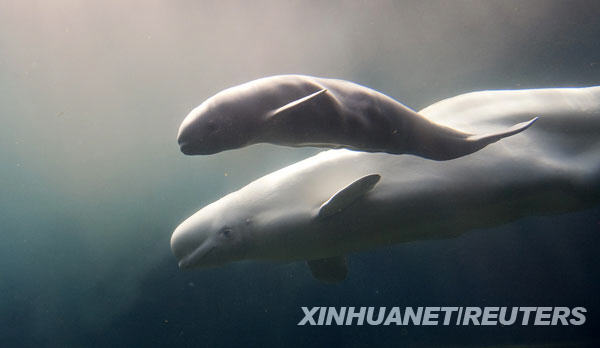 6月7日,在加拿大溫哥華水族館,二十歲的白鯨“極光”和她產(chǎn)下的幼崽在水中暢游。新華社/路透