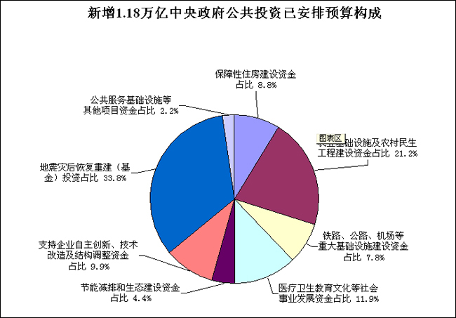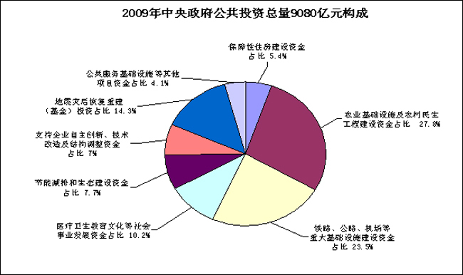 2008年四季度至2010年新增4萬億擴(kuò)大內(nèi)需投資中,新增中央政府公共投資1.18萬億元,其中:2008年四季度安排新增投資1040億元,2009年安排新增投資4875億元,2010年預(yù)計安排新增投資5885億元。 截至目前,1.18萬億元新增中央政府公共投資已安排資金5915億元,分項目情況如下:用于保障性住房建設(shè)資金522億元,占8.8%;農(nóng)業(yè)基礎(chǔ)設(shè)施及農(nóng)村民生工程建設(shè)資金1253億元,占21.2%;鐵路、公路、機(jī)場等重大基礎(chǔ)設(shè)施建設(shè)資金460億元,占7.8%;醫(yī)療衛(wèi)生教育文化等社會事業(yè)發(fā)展資金703億元,占11.9%;節(jié)能減排和生態(tài)建設(shè)資金260億元,占4.4%;支持企業(yè)自主創(chuàng)新、技術(shù)改造及結(jié)構(gòu)調(diào)整資金585億元,占9.9%;地震災(zāi)后恢復(fù)重建(基金)投資2000億元,占33.8%;公共服務(wù)基礎(chǔ)設(shè)施等其他項目資金132億元,占2.2%。 此外,2009年中央政府公共投資預(yù)算總量為9080億元,比上年增加4875億元,分項目安排情況如下:用于保障性住房建設(shè)資金493億元,占5.4%;農(nóng)業(yè)基礎(chǔ)設(shè)施及農(nóng)村民生工程建設(shè)資金2522億元,占27.8%;鐵路、公路、機(jī)場等重大基礎(chǔ)設(shè)施建設(shè)資金2134億元,占23.5%;醫(yī)療衛(wèi)生教育文化等社會事業(yè)發(fā)展資金926億元,占10.2%;節(jié)能減排和生態(tài)建設(shè)資金696億元,占7.7%;支持企業(yè)自主創(chuàng)新、技術(shù)改造及結(jié)構(gòu)調(diào)整資金633億元,占7.0%;地震災(zāi)后恢復(fù)重建(基金)投資1300億元,占14.3%;公共服務(wù)基礎(chǔ)設(shè)施等其他項目資金376億元,占4.1%。 中央政府公共投資無論是總量還是增量安排,均體現(xiàn)了保民生、保增長、保災(zāi)后恢復(fù)重建和調(diào)結(jié)構(gòu)的基本原則和政策取向,如用于民生工程和災(zāi)后恢復(fù)重建資金比重,2009年中央政府公共投資9080億元中占57.7%,2008年四季度及2009年合計新增中央政府公共投資5915億元中占75.7%。