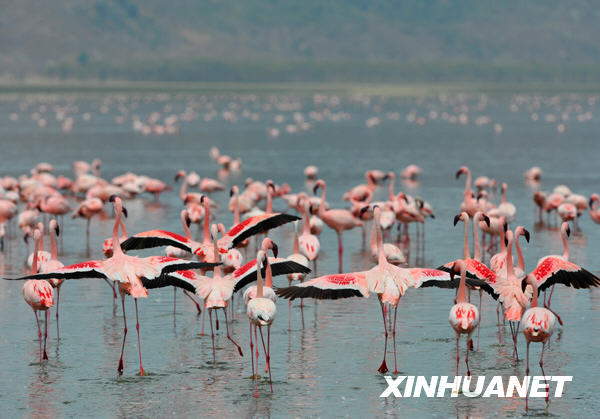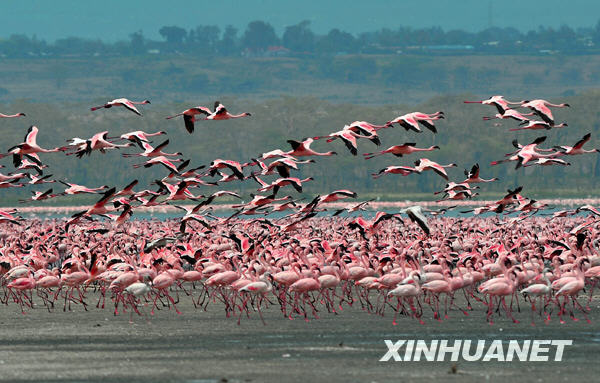近來(lái)受益于環(huán)境保護(hù)、水量增長(zhǎng)等因素,享有“觀鳥天堂”美譽(yù)的肯尼亞納庫(kù)魯湖火烈鳥數(shù)量大增。棲息在湖岸淺水區(qū)域超過(guò)80萬(wàn)只粉紅色的火烈鳥,使納庫(kù)魯湖重現(xiàn)粉色湖岸奇觀。納庫(kù)魯湖是肯尼亞最大的火烈鳥棲息地,數(shù)量曾多達(dá)上百萬(wàn)只,約占世界火烈鳥總數(shù)的三分之一。近些年來(lái)由于淡水減少、湖水鹽堿度過(guò)高等原因,納庫(kù)魯湖火烈鳥數(shù)量急劇下降,2008年期間最少總量一度不足5萬(wàn)只。