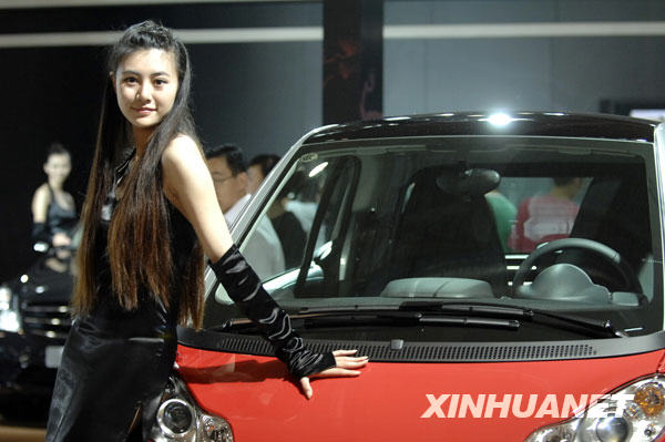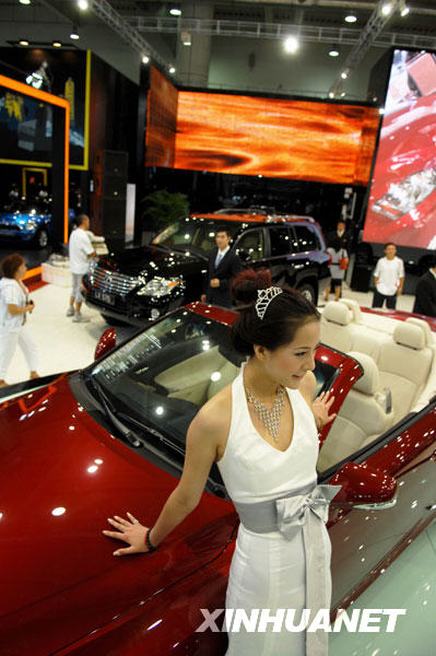 8月19日,一位車模在大連車展上展示汽車。新華社記者章磊 攝