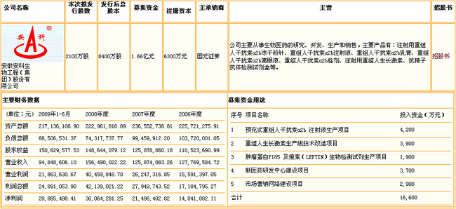 安徽安科生物工程(集團(tuán))股份有限公司主營(yíng)重組人干擾素和重組人生長(zhǎng)激素等生物藥品,擬發(fā)行2100萬(wàn)股,募集資金16600萬(wàn)元,發(fā)行后總股本不超過(guò)8400萬(wàn)股。該公司今年上半年實(shí)現(xiàn)凈利潤(rùn)2088.55萬(wàn)元,每股收益0.33元。 安徽安科生物經(jīng)營(yíng)范圍:自行研制、生產(chǎn)的生物制品、醫(yī)藥(基因重組制品、凝膠劑)及其原料、生化制品的出口和與公司生產(chǎn)、科研相關(guān)的原輔材料、機(jī)械設(shè)備、儀表儀器與零部件的進(jìn)口(特殊規(guī)定的除外);藥物、診斷試劑(體外診斷試劑)、生物技術(shù)和生化工程的原料及產(chǎn)品的研制、生產(chǎn)、銷售,技術(shù)轉(zhuǎn)讓、服務(wù)。