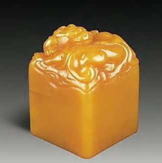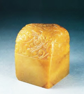880,000 拍賣公司:上海敬華 日期:2001-12-15 說(shuō)明:田黃章料,方正大器,通體質(zhì)地細(xì)膩勻凈潤(rùn)澤,頂部浮雕云龍紋,龍圓眼外凸,鼻翼上翅,體態(tài)健碩,為田黃印章中難得的精品。