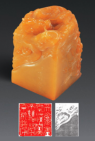 "臣董誥敬篆"款 成交價(jià):RMB2,420,000 拍賣公司:北京翰海拍賣有限公司 日期:2006-06-26 說(shuō)明: 此章隨形紐雕海水蟠龍紋,運(yùn)用了高浮雕、淺刻等技法,雕工圓潤(rùn)、精細(xì)。邊刻"臣董誥敬篆"行書款。董誥(1740-1818),字雅倫,號(hào)蔗林,清富陽(yáng)人,董邦達(dá)長(zhǎng)子。乾隆二十八年(1763),官大學(xué)士,謚文恭。工詩(shī)古文詞,書法宗王義之、獻(xiàn)之,又能于一粒芝麻上書"天下太平"四字。山水稟承家學(xué),由此章可看出其篆刻的功底亦非同一般。該件拍品工精質(zhì)美,加之名人的款識(shí),確定了其御用的皇家身份。