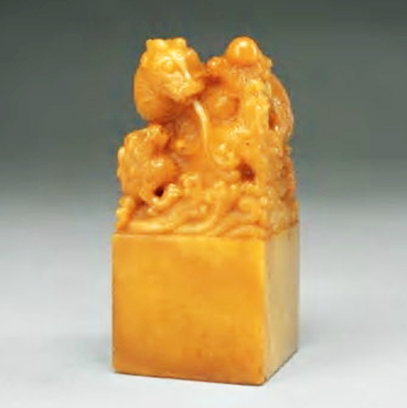 日期:2004-06-24 說(shuō)明:石質(zhì)均勻,色澤溫潤(rùn),所刻獸鈕精細(xì),用刀流暢,將瑞獸的肌骨表現(xiàn)的恰到好處,雙目眉唇細(xì)致講究,材質(zhì)碩大,是近年拍賣場(chǎng)上最重的,重256克。田黃"無(wú)根而璞"無(wú)脈可尋,粒不大而難求,每顆重量在十幾克至百余克,數(shù)百克的極為罕見,逾斤的貢至皇帝。清代藏家每得一田黃,顧視珍惜,"雖強(qiáng)勢(shì)強(qiáng)力不能奪",贊曰:"令玉稱臣"。田黃有六德:細(xì)﹑潔﹑潤(rùn)﹑膩﹑溫﹑凝(晶瑩剔透)。據(jù)傳,乾隆皇帝每年元旦祭天必置田黃石于供案中央,意寓:福(產(chǎn)于福建)﹑壽(壽山)﹑田(黃土一皇家的疆域)﹑吉祥無(wú)比。印文﹕"山東萊州府同知陽(yáng)湖人汪昉珍藏書畫金石之記。"汪昉〔1799-1877〕清,字叔明,號(hào)菽民,又號(hào)啜菽老人,陽(yáng)湖〔今江蘇常州〕人。道光二十四〔1844〕年舉人,官山東萊州府同知。豪飲善詼諧,善山水,筆意松秀,墨法淹潤(rùn),書臨趙孟俯。間作分﹑隸。尤精鑒賞。卒年七十九。