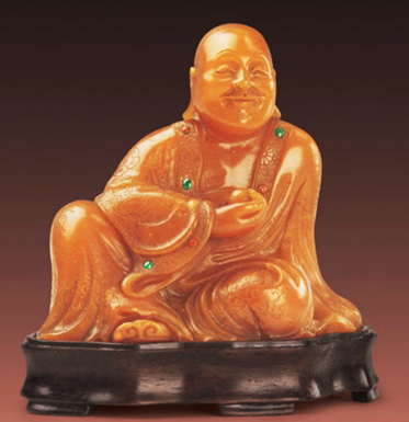 "黃金易得,田黃難求。"此件依田黃石材料巧妙雕制成羅漢像,光頭﹑坦胸﹑一手扶地,一手捧佛珠,身披袈裟,上嵌寶石,神情肅然,舉止端莊?坦ち鲿畅p精致,入手極感舒暢,撫摩久之,則益加不忍釋手,心﹑石相契?芍^"田石羅漢無(wú)量壽,來(lái)結(jié)人間百歲緣。"