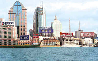 | 圖為上海北外灘琳瑯滿目的跨國(guó)公司廣告牌。陳宇杰