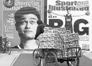 上海,一位工人正用力踏著一輛裝滿可口可樂的人力車行駛在街頭,車旁是一幅印有姚明頭像的美國NBA體育雜志的廣告。2008年12月14日晚,由大學(xué)生組成的社會調(diào)查小組,在北京中央民族大學(xué)發(fā)布《可口可樂調(diào)查報(bào)告》,稱可口可樂嚴(yán)重侵害派遣工利益,呼吁姚明、劉翔停止為可口可樂代言。CFP供圖 |