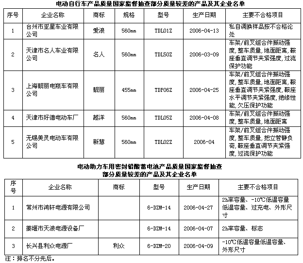 此次共抽查了天津、江蘇、浙江、上海、山東、廣東、四川等七個(gè)省、市部分企業(yè)生產(chǎn)的產(chǎn)品。抽查結(jié)果表明,大型企業(yè)的產(chǎn)品質(zhì)量繼續(xù)保持較高水平,產(chǎn)品抽樣合格率均超過90%,而小型企業(yè)的產(chǎn)品質(zhì)量問題較多,整車抽樣合格率為65.7%,車用蓄電池抽樣合格率僅為58%。