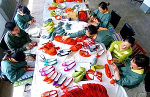 5月22日,繡花布鞋店老板郭麗(右二)在車間和工人們一起加班加點制作精美的繡花布鞋。本報記者 遲海峰 攝