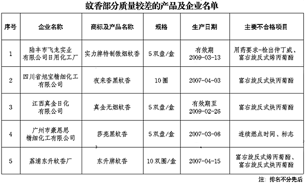 日前,國家質(zhì)檢總局對盤式蚊香產(chǎn)品質(zhì)量進行了國家監(jiān)督抽查,產(chǎn)品抽樣合格率為87.4%。 此次抽查對盤式蚊香產(chǎn)品的用藥要求、連續(xù)燃點時間、有效成分含量、藥效以及標志等五個項目進行了檢驗,共涉及廣東、福建、江西、湖南、廣西、湖北、四川、重慶、浙江、江蘇等10個省份87家企業(yè)生產(chǎn)的87種產(chǎn)品(不涉及出口產(chǎn)品)。經(jīng)檢驗,所檢產(chǎn)品藥效指標均符合國家強制性標準規(guī)定的要求。 此次抽查結果表明,大中型生產(chǎn)企業(yè)產(chǎn)品抽樣合格率為100%,產(chǎn)品質(zhì)量較好,但個別小型企業(yè)產(chǎn)品存在一些質(zhì)量問題,例如個別產(chǎn)品用藥要求不合格,為提高殺蟲效果,超范圍使用農(nóng)藥,違規(guī)添加國家明令禁止的農(nóng)藥仲丁威;個別產(chǎn)品包裝標識不規(guī)范;個別產(chǎn)品連續(xù)燃點時間達不到標準規(guī)定的要求。 抽查中發(fā)現(xiàn),個別產(chǎn)品有效成分含量偏低或偏高,有效成分含量偏低,達不到驅蚊效果;偏高則對人體健康安全有影響。