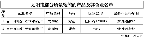 日前,國家質檢總局組織對太陽鏡產(chǎn)品質量進行了國家監(jiān)督抽查,共抽查了北京、河北、山西、上海、江蘇、浙江、安徽、陜西等八個省、直轄市71家企業(yè)生產(chǎn)的90種產(chǎn)品(不涉及出口產(chǎn)品),產(chǎn)品實物質量合格率為86.7%。 此次抽查中發(fā)現(xiàn)的主要質量問題有,第一,個別產(chǎn)品紫外透射比不合格。強制性國家標準規(guī)定,太陽鏡產(chǎn)品的紫外透射比應小于5%。抽查中有個別產(chǎn)品紫外透射比不合格。配戴這種眼鏡在遮擋部分可見光的同時,沒有阻隔紫外線,比不戴眼鏡所接受的紫外光還要多,眼睛接受太多紫外線,容易引發(fā)眼疾。 第二,個別產(chǎn)品標簽標注不規(guī)范。太陽鏡按用途可分為遮陽鏡、淺色太陽鏡和特殊用途太陽鏡三類,強制性行業(yè)標準規(guī)定,太陽鏡應注明類別。抽查中有個別產(chǎn)品是未注明太陽鏡類別,未標注工業(yè)產(chǎn)品生產(chǎn)許可證標志和編號。