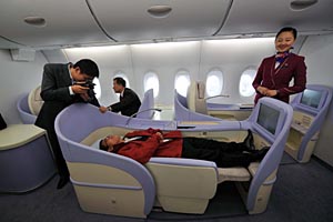 在飛機成為人們主要旅行交通工具的現(xiàn)代社會,因各種原因成為“空中飛人”的人可能都有這樣的感受:在飛機上長途旅行太辛苦。擁擠的座位讓你即使蜷縮著也無法入睡,而鄰座與別人閑談就像在你耳邊說話。 各國航空公司認識到,價格戰(zhàn)不再是吸引顧客的惟一手段,讓那些富有且追求舒適感的乘客在寬松、舒適的環(huán)境中乘機成為吸引高端乘客的賣點之一。最能令乘機長途旅行的客人感到舒適的服務(wù)莫過于能夠讓他們在飛機上平躺著睡覺。