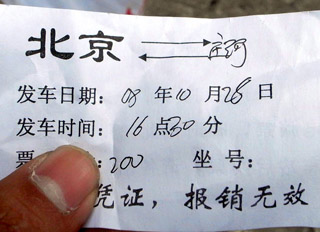 10月20日下午14時,記者來到北京西站北一出口的地下出站廣場,這里有一個免費問詢臺,上方懸掛了幾個電子顯示屏,顯示著從北京出發(fā)的長途客車線路。 此前記者了解到,每天都有大量的乘客被如此“安排”到長途客車上。而據(jù)記者觀察,不到一個小時,就有33名乘客從這里被安排到了長途客車上。 問詢臺內(nèi)坐著幾個身著便服的“工作人員”,有乘客詢問事項時,他們也會給予解答,但當有人問長途車的問題時,他們會馬上回應:“我們是八王墳長途客運站設在這里的售票網(wǎng)點,考慮到北京西站往東北方向去的車次很少,為了減少乘客從北京西站趕到八王墳的麻煩,我們在這里有專車接送,能直接把乘客送到開往東北的長途大客車上! 據(jù)“工作人員”介紹,16時會有一班長途車發(fā)往沈陽,票價是160元。記者交錢后,得到一張名片大小的紙片,上面印著“北京到沈陽”字樣和票價等信息,紙片的背面則印著“由于時間關(guān)系,代售點無法出電腦票,臨時用此憑證,到長途車站后換票,請各位旅客諒解”。 隨后,一名“工作人員”把記者帶到一塊空地上候車,在這里已經(jīng)有10多名乘客。這個“候車區(qū)”有專人維持秩序,每隔20多分鐘就會有一名年輕男子從問詢臺里走出,大喊“去XX地的乘客跟我走!”隨后帶領(lǐng)乘客向北京西站東停車場走去。 15時45分,那名年輕人再次走出問詢臺高喊:“去沈陽的跟我走了!”連同記者在內(nèi)的8名乘客被帶進停車場,乘坐一輛面包車離開。記者與面包車司機聊天得知,北京西站有多輛面包車負責拉送乘客到京沈高速公路輔路。 16時10分,面包車來到了位于北京市朝陽區(qū)方家村附近的京沈高速公路輔路上,兩輛懸掛著“北京-沈陽”牌子的大客車正停在路邊候客。 包括記者在內(nèi)的8名乘客被安排在其中一輛大客車上,在確認完人數(shù)后,大客車的售票員交給面包車司機160元。又等到幾批乘客后,17時20分,大客車才駛?cè)刖┥蚋咚僦髀贰?BR> 最后,在記者的強烈要求下,售票員才拿出一張既沒有始發(fā)站標注、也不能作為報銷憑證的代客票。